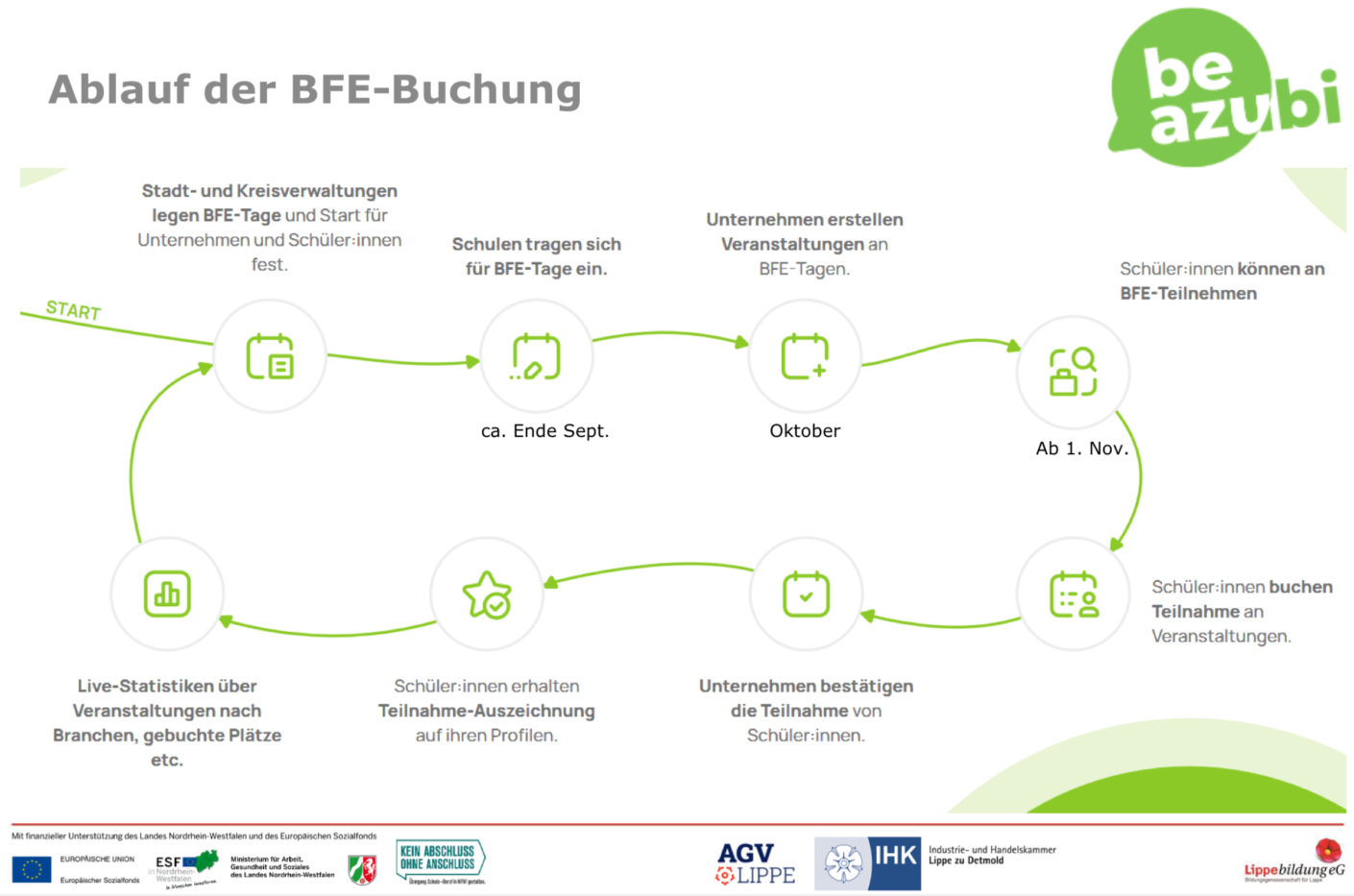 - Schulen legen die Termine für die BFE-Tage zu Beginn des Schuljahres fest und teilen diese der Kommunalen Koordinierung (Schu.B.) mit (schak@lippe-bildung.de). Diese trägt die BFE-Termine in beAzubi bis zum 30.09.2024 ein.
