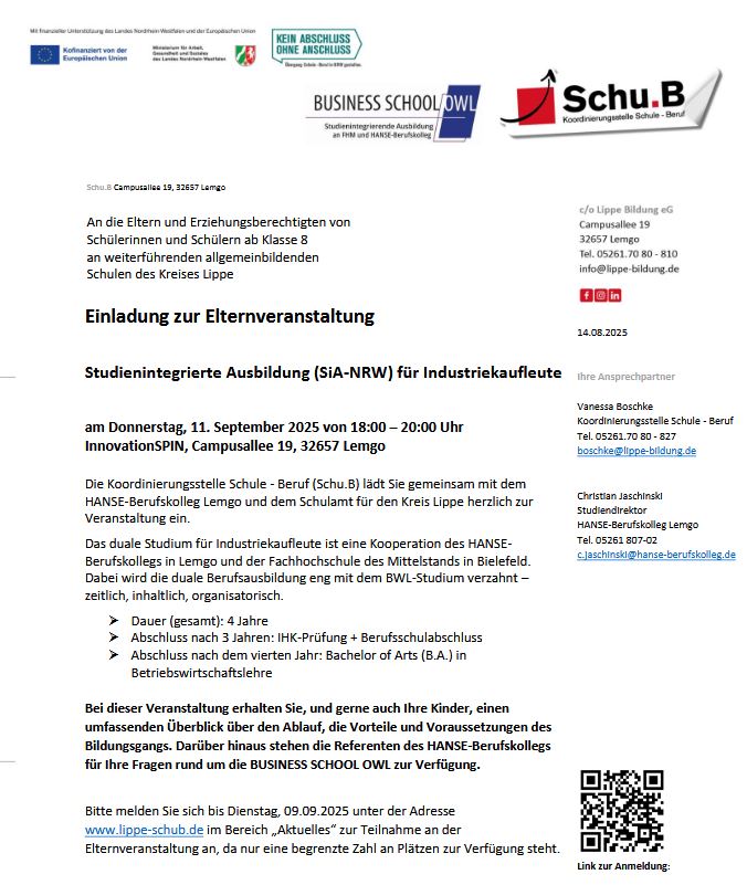Die Koordinierungsstelle Schule – Beruf (Schu.B) lädt Sie gemeinsam mit dem HANSE-Berufskolleg Lemgo und dem Schulamt für den Kreis Lippe herzlich zur Elternveranstaltung ein: