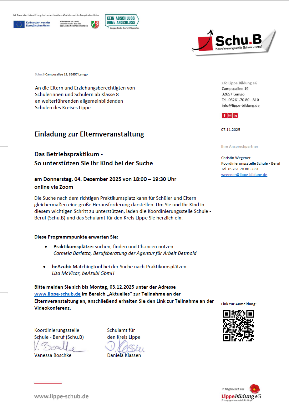 Die Suche nach dem richtigen Praktikumsplatz kann für Schüler und Eltern gleichermaßen eine große Herausforderung darstellen. Um Sie und Ihr Kind in diesem wichtigen Schritt zu unterstützen, laden die Koordinierungsstelle Schule – Beruf (Schu.B) und das Schulamt für den Kreis Lippe Sie herzlich ein: