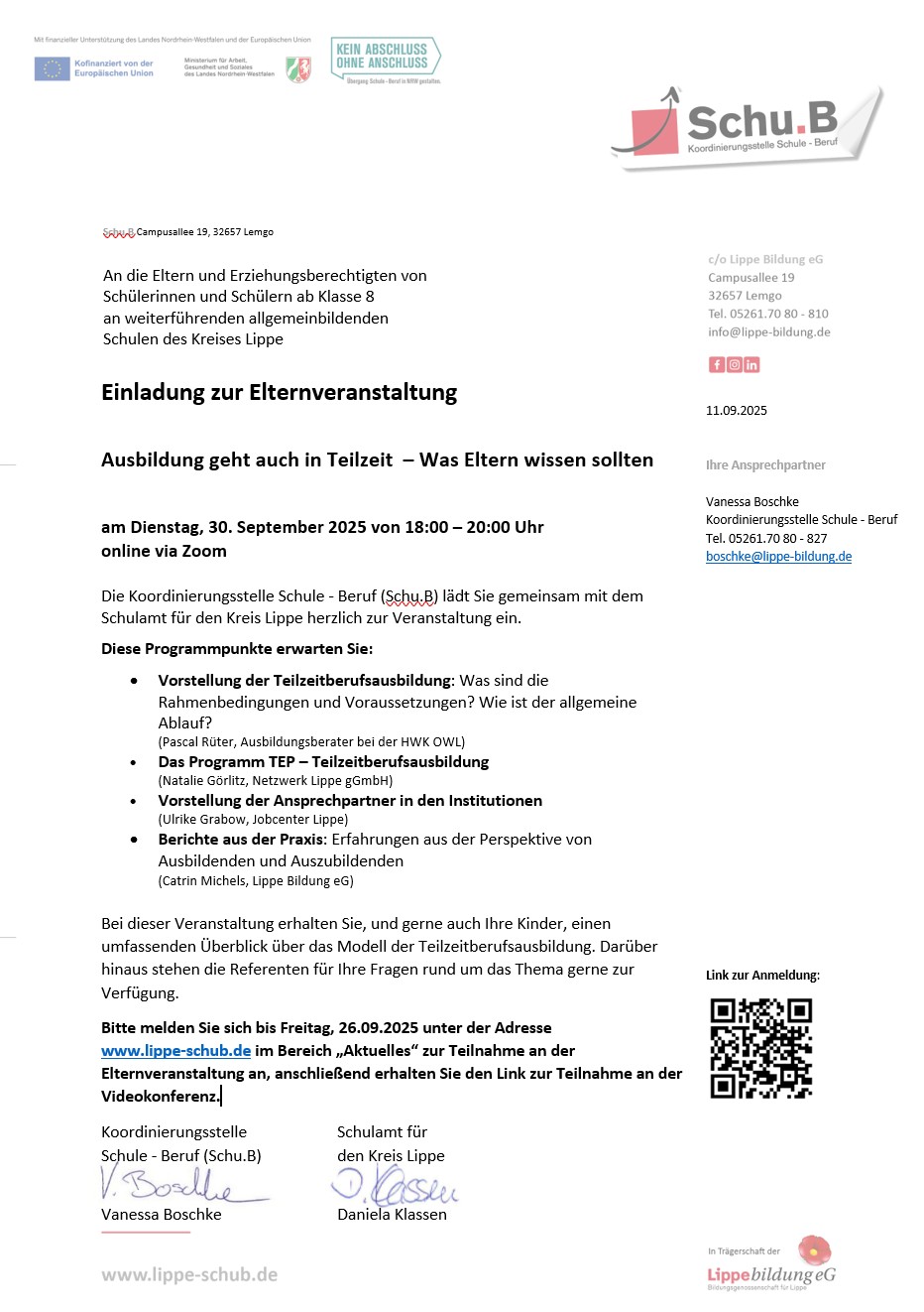 Die Koordinierungsstelle Schule – Beruf (Schu.B) lädt Sie gemeinsam mit dem Schulamt für den Kreis Lippe herzlich zur Veranstaltung ein.