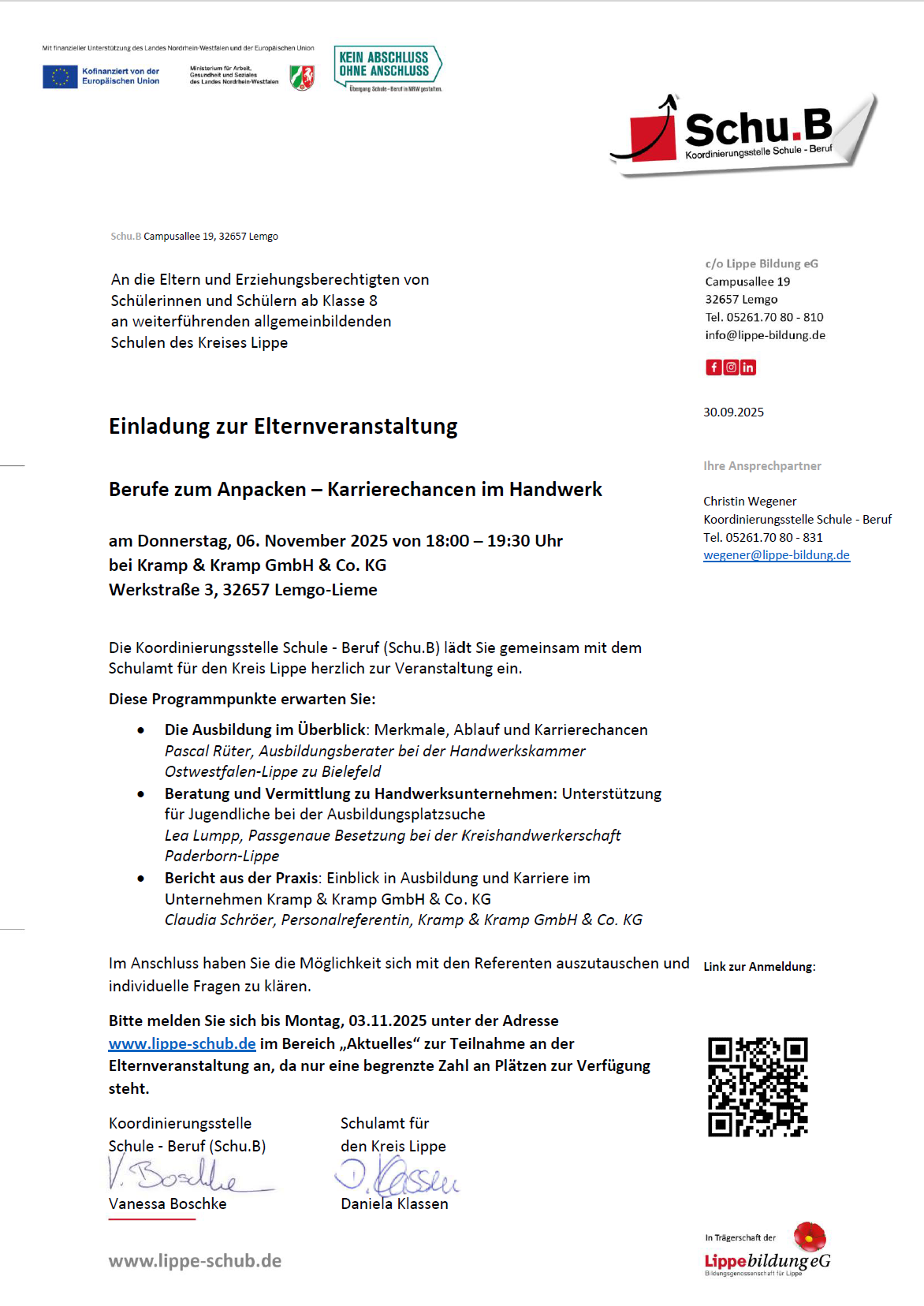 Die Koordinierungsstelle Schule – Beruf (Schu.B) lädt Sie gemeinsam mit dem Schulamt für den Kreis Lippe herzlich zur Veranstaltung ein.
