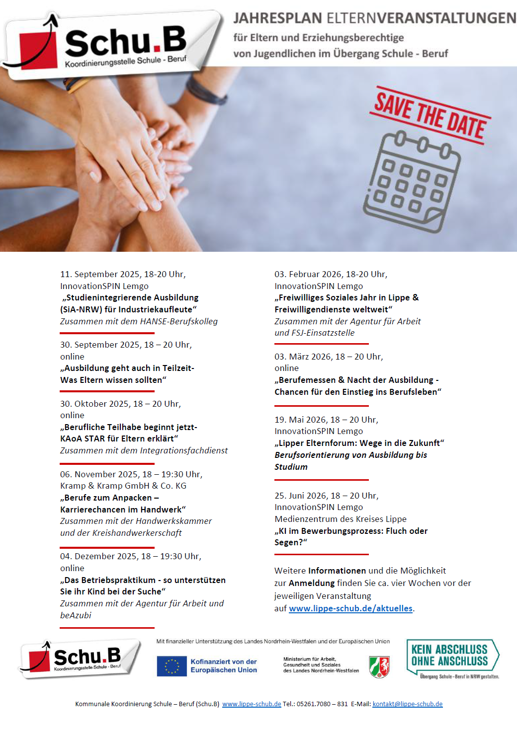 Die wichtigsten Ansprechpersonen der Region stehen hier für Fragen zur Ausbildungssuche, zur Bewerbung, zum Studium oder dem weiteren Schulbesuch zur Verfügung. Schüler:innen und ihre Eltern haben die Möglichkeit, mit den bildungsrelevanten Institutionen persönlich in Kontakt zu treten, sich zu beraten und zu informieren.