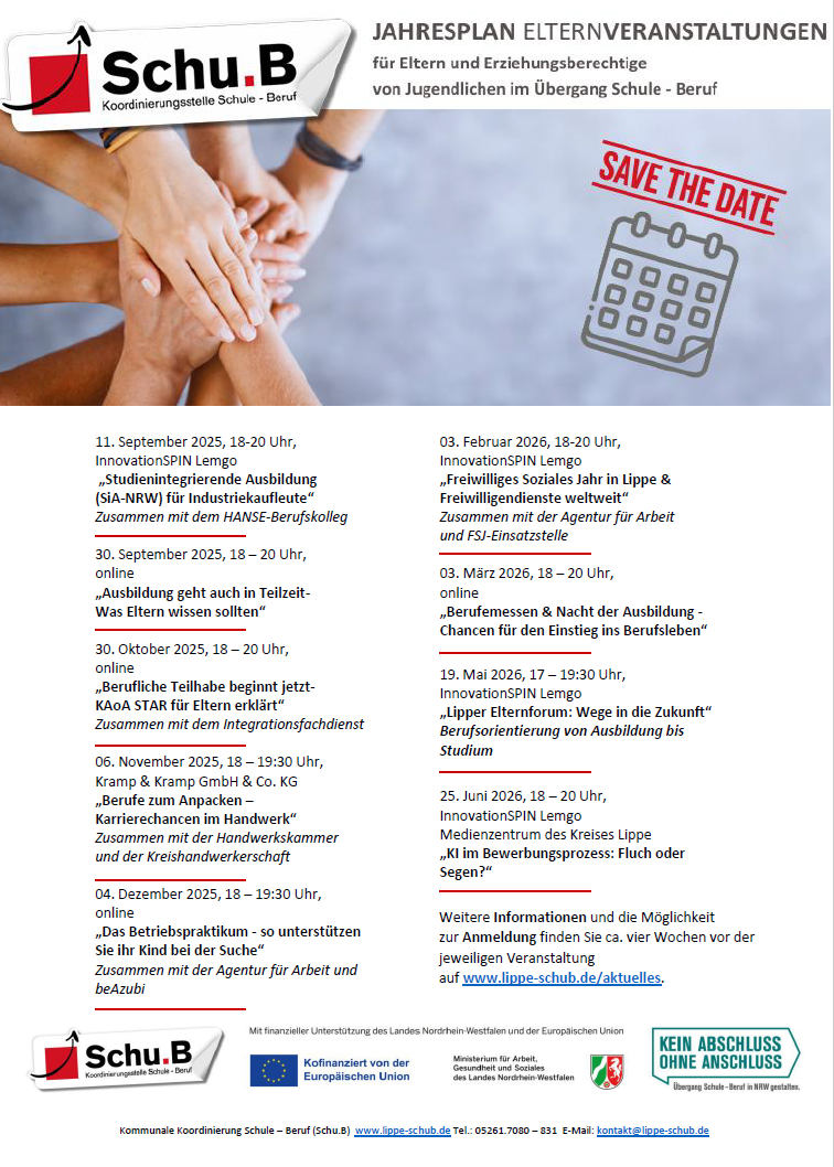 • Veranstaltungskalender: Aktuelle Informationen über Aktivitäten, Messen und Veranstaltungen zur Berufsorientierung in Lippe.