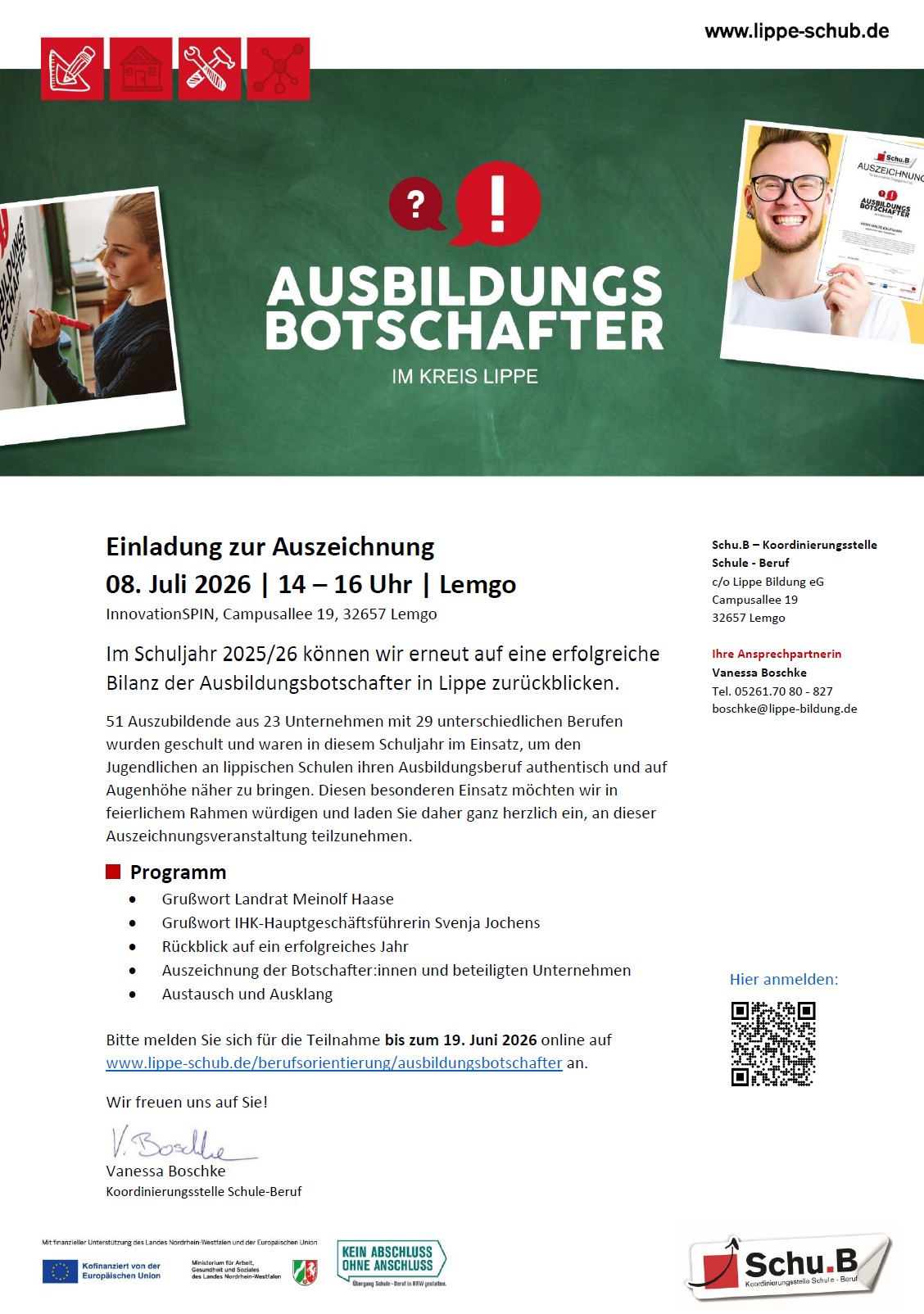 Im Rahmen der Veranstaltung wird der Landrat, Herr Meinolf Haase, die Auszeichnungen an die Botschafter:innen überreichen. Darüber hinaus möchten wir darüber informieren, was in diesem Schuljahr mit den Ausbildungsbotschaftern in Lippe erreicht wurde.