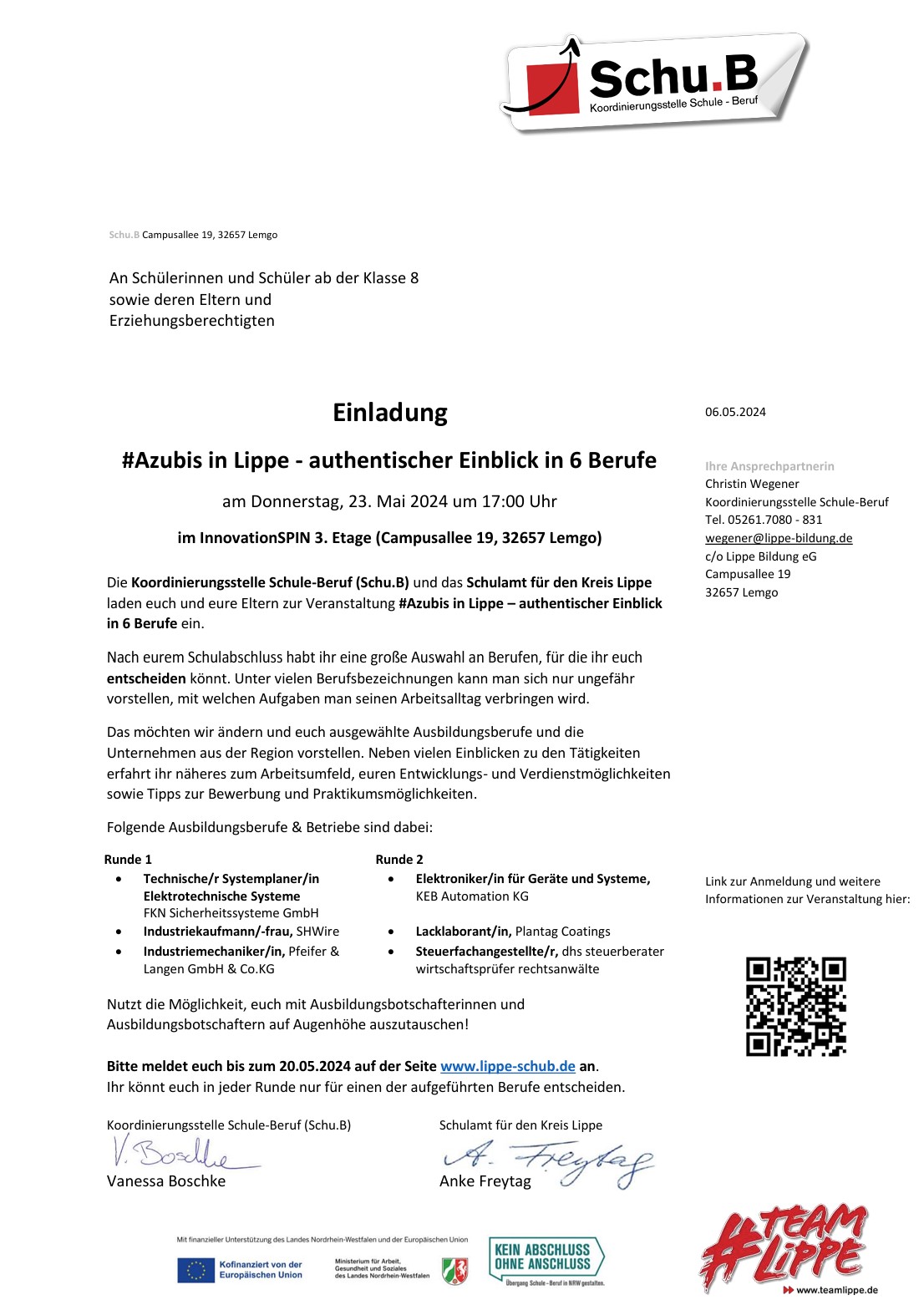 Die Koordinierungsstelle Schule-Beruf (Schu.B) und das Schulamt für den Kreis Lippe laden Schüler:innen und Eltern zur Veranstaltung #Azubis in Lippe – authentischer Einblick in 6 Berufe ein.